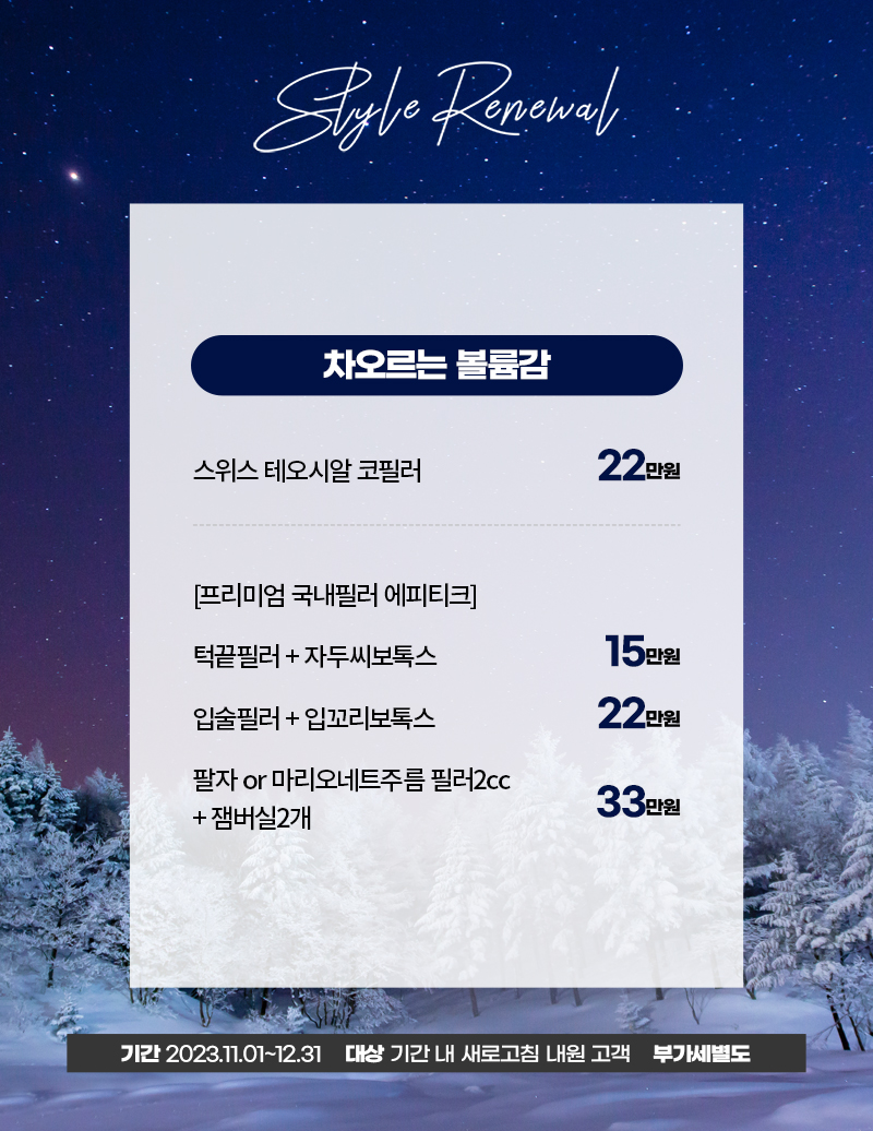 이벤트기간 : 2023-10-31 ~ 2023-12-31 필러보톡스 페이지 정보 작성자 최고관리자 댓글 0건 조회 2,520회 목록 종료 본문 필러보톡스 목록 이전글 레이저토닝 23.10.31 다음글 주름보톡스 혜택 23.10.31 댓글 0 댓글목록 등록된 댓글이 없습니다.