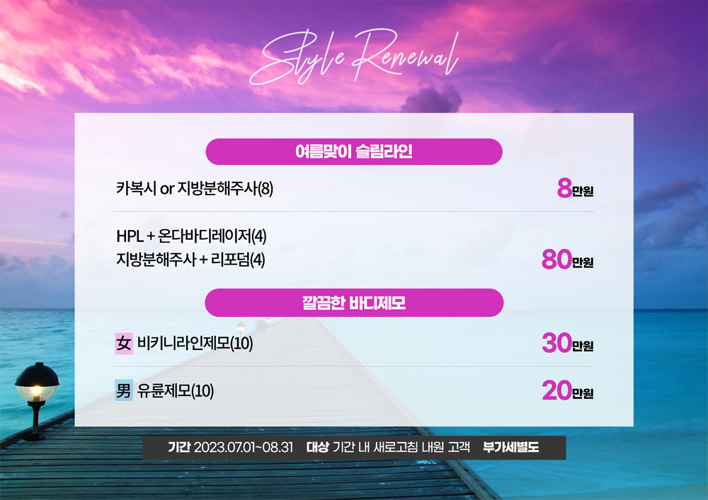 이벤트기간 : 2023-07-01 ~ 2023-07-31 바디제모혜택 123 페이지 정보 작성자 최고관리자 댓글 0건 조회 2,942회 목록 종료 본문 목록 이전글 쁘띠 혜택 23.06.30 다음글 무결점 피부 완성 23.06.30 댓글 0 댓글목록 등록된 댓글이 없습니다.